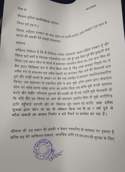 महिला पत्रकार द्वारा धमकी और फोन पर हुई बदसलूकी की घटना की शिकायत दुर्ग आई जी रामगोपाल गर्ग तथा दुर्ग एसपी विजय अग्रवाल से की गई है जिसे गंभीरतापूर्वक लेते हुए आई जी तथा एसपी ने मामले की जांच कर उचित कार्यवाही करने का आश्वाशन दिया है।