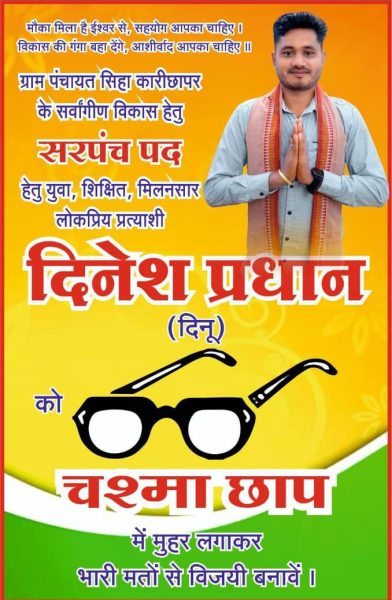 “गांव के विकास और हर व्यक्ति के उत्थान के लिए संकल्पित हूं। अगर जनता का आशीर्वाद मिला, तो वादों को पूरा करना मेरा पहला कर्तव्य होगा,” – दिनेश प्रधान, सरपंच प्रत्याशी, ग्राम पंचायत सिहा।