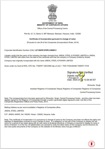 जिन्दल स्टील एंड पावर लिमिटेड का नाम बदलकर जिन्दल स्टील लिमिटेड हुआ