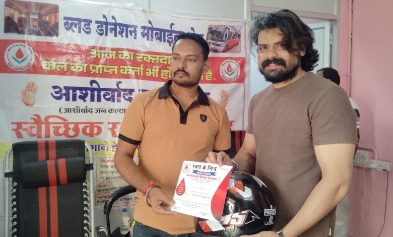 रायपुृर। छॉलीवुड के सुपरस्टार, चार्मिंग एक्टर दिलेश साहू ने अपने जन्मदिन पर रक्तदान किया। आशीर्वाद फाउंडेशन के सहयोग से रक्तदान शिविर का आयोजन किया गया। इस दौरान जानकी फिल्म की अभिनेत्री अनिकृति चौहान ने रक्तदान किया। इस शिविर में युवाओं ने बढ़-चढ़कर भाग लिया और रक्तदान किया। फाउंडेशन ने रक्तदान करने वाले लोगों को प्रमाण पत्र के साथ हैलमेट भेंट किया।