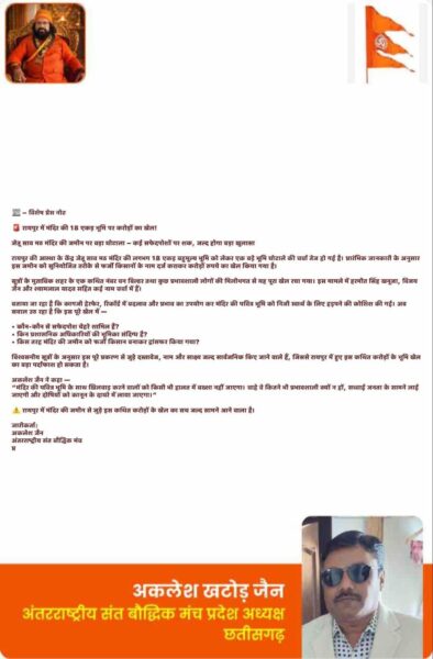 रायपुर में मंदिर की 18 एकड़ भूमि पर करोड़ों का खेल! जैतूसाव मठ मंदिर की जमीन पर बड़ा घोटाला – कई सफेदपोशों पर शक, जल्द होगा बड़ा खुलासा…..