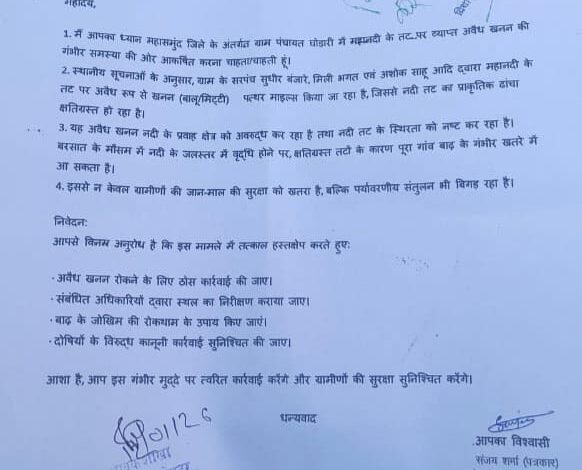 शिकायत में आरोप लगाया गया है कि ग्राम के सरपंच सुधीर बंजारे तथा उनके कथित सहयोगियों द्वारा बालू, मिट्टी और पत्थरों का अवैध रूप से खनन कराया जा रहा है। इससे महानदी के तट का प्राकृतिक ढांचा लगातार कमजोर हो रहा है और नदी के प्रवाह क्षेत्र में अवरोध उत्पन्न हो रहा है।