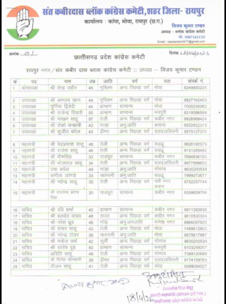घोषित कार्यकारिणी में मोवा से शेख जहीर को कोषाध्यक्ष नियुक्त किया गया है। उपाध्यक्ष पद पर अमजद खान, पूर्णिमा द्विवेदी, राजेंद्र तिवारी, माखन साहू, राेंको (धनछतरी) एवं सुजीत बघेल को जिम्मेदारी सौंपी गई है। सचिव पद पर शंकर साहू, नरेंद्र डोडर, तीजन साहू, रवि शर्मा, बलदेव यादव, नरेंद्र गुरु, मनोज वर्मा, संतोष दुबे, आदित्य साहू, दिनेश सोनवानी एवं अन्य कार्यकर्ताओं को नियुक्त किया गया है।