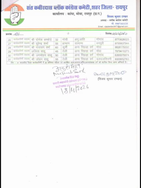 रायपुर शहर जिला कांग्रेस कमेटी के अध्यक्ष श्री कुमार शंकर मेनन जी की अनुशंसा पर संत कबीर दास ब्लॉक कांग्रेस कमेटी का गठन किया गया है। इस संबंध में ब्लॉक कांग्रेस अध्यक्ष श्री विजय कुमार टंडन जी द्वारा नई कार्यकारिणी की घोषणा की गई।